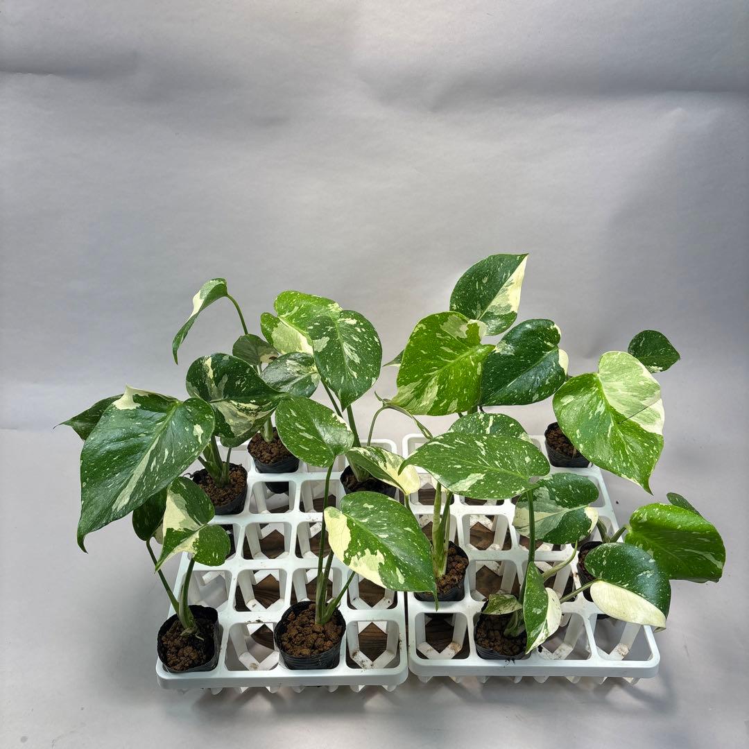 モンステラ デリシオーサ ホワイトモンスター 天津蘭 オリジナルMonstera Deliciosa WhiteMonster 天津蘭 OCこちらの個体は生前伊藤氏が天津蘭と名付け、以降ホワイトモンスターという名で西畠氏が世に広めたモンステラ。ここ2.3年でTC苗が出回り価格は落ち着いてきたものの、OCとしての価値はマニアにとって貴重な物となりました。斑の特徴としてフルムーンや白ミント、散り斑も複雑な一面を持っています。また生長過程で緑葉になりやすい傾向にあります。しかし、切り戻す事で必ずと言っていいほど斑入り葉が復活します。TC個体が出回り始める前入手したOC個体で、詳細が知りたい方はご購入後お伝えさせていただきます。こちらの株は元茎も太かったため、脇芽2枚共に切れ込み穴あきが綺麗に出ています。斑入り葉も申し分ありません。白斑が強いため少々痛みあり。下葉の葉柄が地中に埋まっていますが、葉に痛みありカットしてます。元株の節複数あります。根張り良好。おそらく7〜8号鉢になります。《発送方法》鉢のままメルカリ便での発送です。防寒対策はしっかりと行います。ラベルは付属しません。