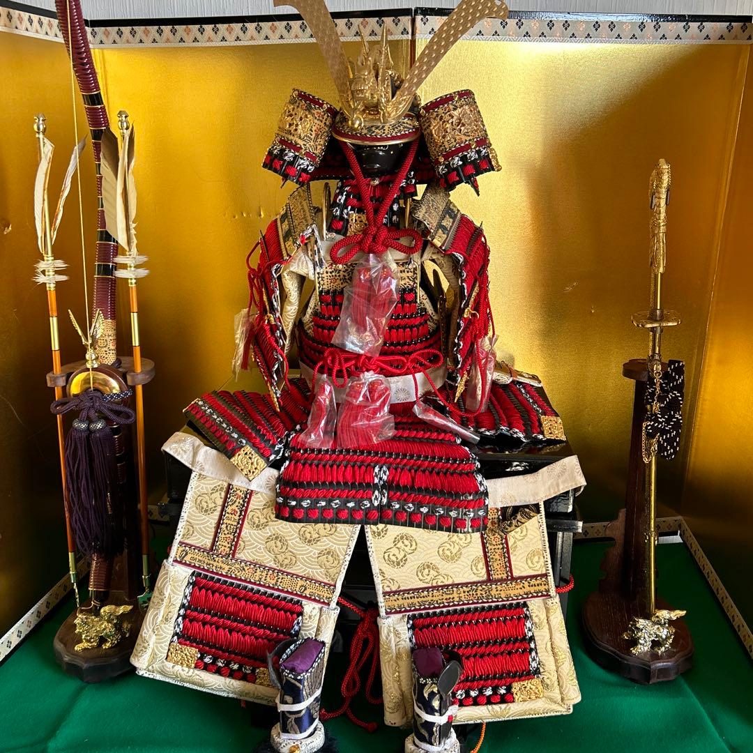 端午の節句 兜数回しか飾っていません。長期保管にて、ご了承下さい。水晶がはまっている上の爪の先の部分が欠けたので、接着剤で補強しております。その点もご了承下さい。畳台寸法 縦51㎝ 横65.5㎝ 高さ9㎝